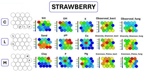 Trained SOM for medium-term fruit cropping system (strawberry) performed on the categorical group “climatic zone” for the three categorical variables considered: Continental (C), Alpine (L), and Mediterranean (M). On the left side, the maps of input records (black and white) split for the three categorical variables considered. On the right side, the heatmaps for each experimental variable show the value distribution among the units in color-code (blue = low value, red = high value).