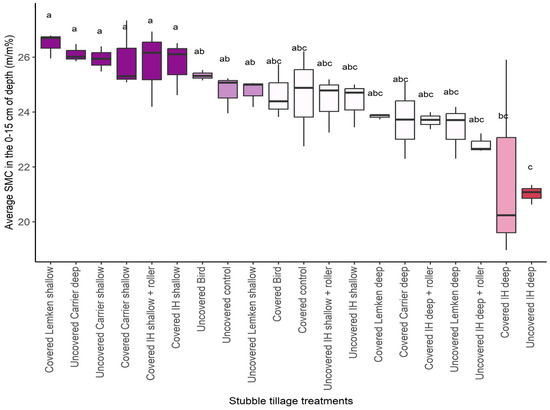 The impact of various stubble tillage methods on soil moisture content at 0–15 cm depth in the case of covered and uncovered surfaces. Results from a Tukey HSD analysis are shown as letters over the boxplots. Treatments sharing the same letter and color are not significantly different from each other at p > 0.05 level.