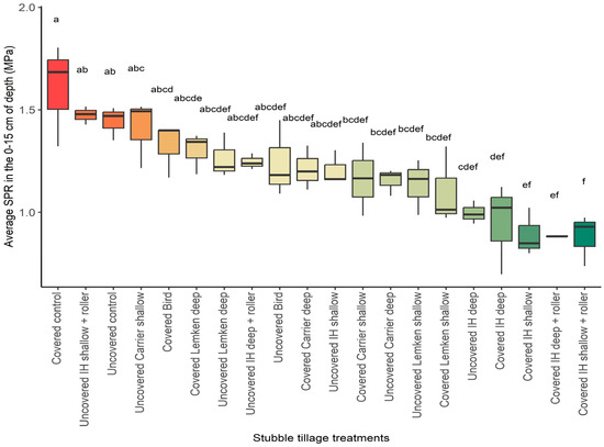 The impact of various stubble tillage methods on soil penetration resistance at 0–15 cm of depth in the case of covered and uncovered surfaces. Results from a Tukey HSD analysis are shown as letters over the boxplots. Treatments sharing the same letter and color are not significantly different from each other at p > 0.05 level.