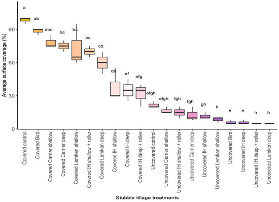The impact of various stubble tillage methods on soil surface coverage in the case of covered and uncovered surfaces. Results from a Tukey HSD analysis are shown as letters over the boxplots. Treatments sharing the same letter and color are not significantly different from each other at p > 0.05 level.