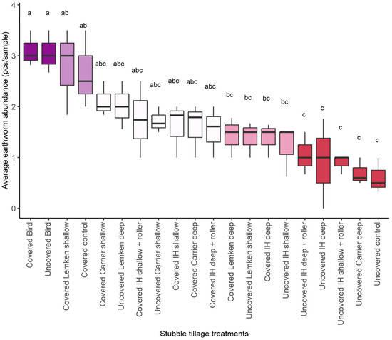 The impact of various stubble tillage methods on earthworm abundance in the case of covered and uncovered surfaces. Results from a Tukey HSD analysis are shown as letters over the boxplots. Treatments sharing the same letter and color are not significantly different from each other at p > 0.05 level.