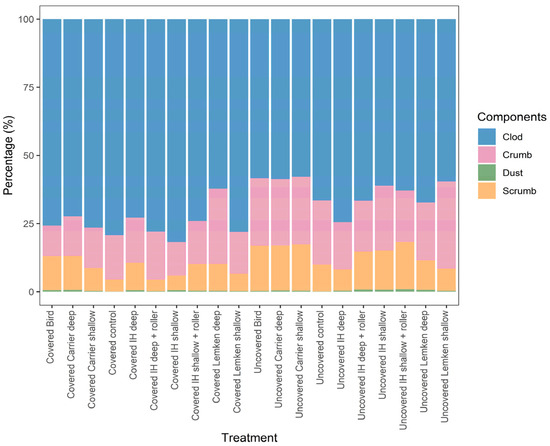 In the evaluation of the agronomic structure results, it should be taken into account that the measurements were made during a wetter-than-average summer. Regarding the uncovered treatments, the Carrier shallow (clod: 40.0%, crumb: 42.2%, small crumb: 17.4%, dust: 0.4%), Carrier deep (clod: 41.2%, crumb: 41.3%, tiny crumb: 17.0%, dust: 0.5%), Bird cultivator (clod: 41.2%, crumb: 41.7%, small crumb: 16.8%, dust: 0.3%), and IH shallow + roller (clod: 43.7%, crumb: 37.1%, small crumb: 18.3%, dust: 0.9%) treatments were considered optimal based on [50,62], while the IH shallow treatment became the least appropriate with the highest clod (65.89%) and the lowest small crumb (8.21%) and crumb (25.5%) content (Figure 6). Due to the wet summer, the proportion of the dust fraction was generally lower than 1%, while the proportion of the clod fraction was at least 40% in every uncovered treatment. During the stubble tillage of uncovered areas, the dust fraction increased the most by 0.2–0.9%. The Bird cultivator treatment produced the least dust (+0.2%), while the plots shallowly tilled with the IH disk and rolled in separate threads produced the most (+0.9%).