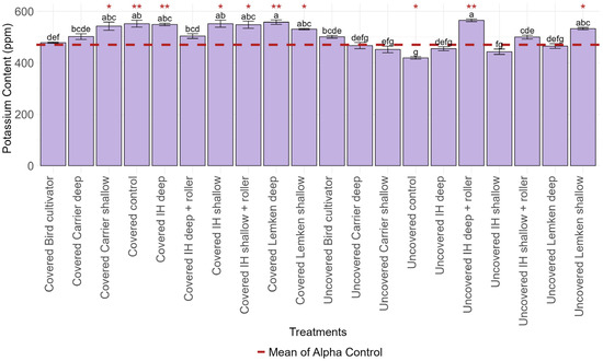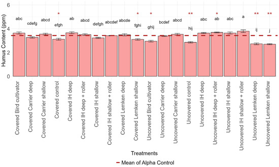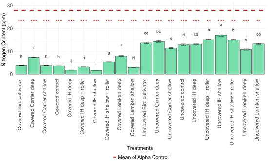 Changes in nitrogen content (mean ± SD) across 20 soil stubble tillage technologies compared to the baseline (red dashed line). Red asterisks indicate significant differences between pre- and post-treatment nitrogen content (** p < 0.01; *** p < 0.001), while treatments sharing the same letters do not significantly differ from each other at the p < 0.05 level at the end of the experiment, as determined by Tukey HSD. Treatments are categorized by covered and uncovered conditions, with reductions reflecting the influence of microbial activity, straw decomposition, tillage depth, and surface coverage on nitrogen dynamics.