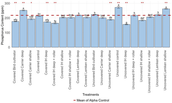 The ANOVA results confirmed significant differences among treatments [F(19,40) = 494.6, p < 0.001], and Tukey HSD comparisons categorized treatments into distinct statistical groups. The highest nitrogen levels were observed in the Uncovered IH shallow (17.05 ppm, group “a”), followed by Uncovered IH deep + roller (15.10 ppm, group “b”), and Uncovered IH shallow + roller (15.00 ppm, group “b”). The lowest levels were found in Covered IH shallow (1.61 ppm, group “j”) and Covered IH deep (1.79 ppm, group “ij”). These results highlight the impact of straw incorporation, tillage depth, and surface coverage on nitrogen dynamics. Covered plots demonstrated the most substantial nitrogen losses due to active microbial decomposition, while uncovered plots showed greater nitrogen retention, albeit with some variability depending on the treatment. These findings underscore the role of microbial activity and environmental conditions in determining nitrogen availability in the soil.