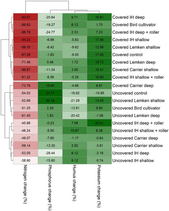 In the uncovered treatments, the nitrogen losses were less severe compared to their covered counterparts. The largest reductions were measured in the Uncovered IH shallow + roller (−61.29%) and Uncovered IH deep (−59.14%), whereas the smallest reduction occurred in the Uncovered Control (−39.43%). The uncovered plots, particularly the Uncovered Control, exhibited less nitrogen depletion due to lower levels of microbial activity and reduced straw incorporation. Interestingly, the Uncovered IH shallow (+17.05 ppm) had the highest nitrogen content among all treatments, indicating that minimal mixing or disturbance can retain more nitrogen in certain scenarios.