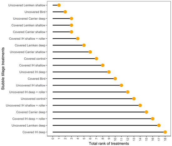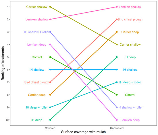 The surface coverage with stubble residues of the uncovered treatments showed significant differences [F(9,20) = 16.324, p = 0.001]. For example, the Uncovered Control treatment (21.67 ± 2.88%) had the highest surface coverage with stubble residues, which was statistically different from the Uncovered IH deep (6.00 ± 1.73%), the IH deep + roller (5.00 ± 0.01%), the IH shallow + roller (15.00 ± 5.00), the IH shallow (11.67 ± 2.88%), the Lemken deep (5.00 ± 0.02%), the Bird (6.00 ± 1.73%), and the Lemken shallow (8.33 ± 2.88%) treatments. However, it is important to note that the Carrier shallow (16.67 ± 2.87%) and the Carrier deep (12.68 ± 6.43%) treatments did not show significant differences compared to the Uncovered Control.
