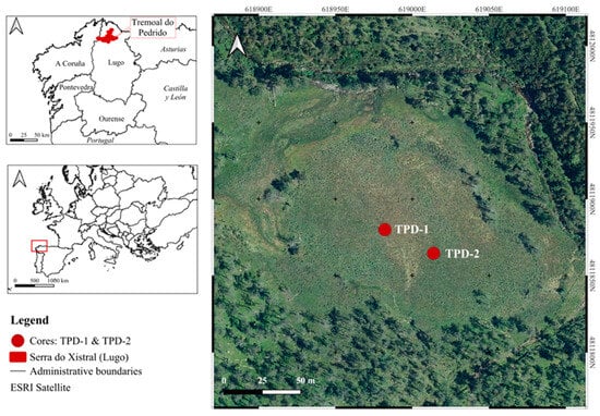 Location map of the Serra do Xistral Mountains (Lugo, Galicia, NW Spain) and the two peat cores collected in the dome of the Tremoal do Pedrido mire.