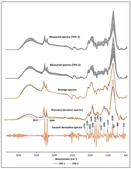 The FTIR spectra of the measured peat samples, as well as their average, standard deviation, and average second-derivative spectra are presented in Figure 2. As it is readily apparent, the spectral signals of the analysed samples from the two peat cores (TPD-1 and TPD-2) look very much alike and are indicative of typical FTIR absorbance spectra of peat material. All the spectra have many features in common, such as the broad absorption occurring between 3400 and 3200 cm−1, two well-defined peaks at bands around 2919 and 2850 cm−1, and numerous individual peaks within the fingerprint region between 1800 and 700 cm−1, representative of peat organic matter (pOM) [,,,].