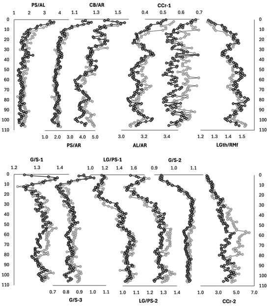 The records of the MIR indices are shown in Figure 3, grouped in seven main depth patterns based on their similarities. The first pattern is shown by PS/AL, PS/AR, and CB/AR, indices that are highly correlated (Pearson correlation coefficient r 0.73–0.95, p < 0.01; Table S1) between them. They show a rapid decrease in the upper 20 cm of the cores and almost constant or slightly decreasing values with depth. Values do not differ much between TPD-1 and TPD-2 (Figure 3). Apart from the main trend, the CB/AR ratio also shows a secondary pattern of shorter cycles of variation.