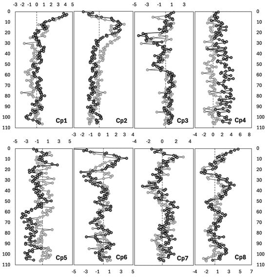 Depth records of the scores of the eight extracted principal components. TPD-1, grey line; TPD-2, black line. The dashed line represents the zero value.