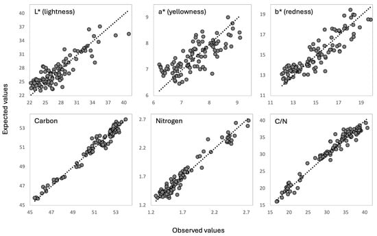 Relationship between observed and expected values, obtained with the multilinear regression models, for the peat properties of the TPD-2 core. L*, a*, b*: CIELab space; C and N in percentage.
