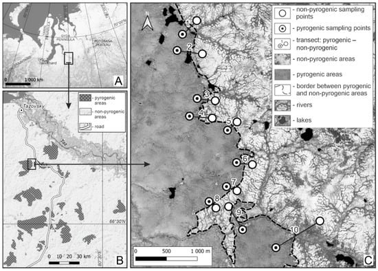 Climate change significantly impacts Arctic and sub-Arctic ecosystems, including the forest–tundra of Western Siberia. In recent decades, natural fires have become more frequent in these regions, a trend closely linked to climate change. Rising summer temperatures and reduced precipitation lead to the desiccation of vegetation and ground litter, creating favorable conditions for the onset and spread of fires [1,2,3,4,5,6]. Fires play a pivotal role in altering soil ecosystems in high-latitude territories. In addition to the destruction of vegetation and organic matter (mortmass), they strongly influence the transformation of the upper organic and mineral soil horizons [7,8,9].