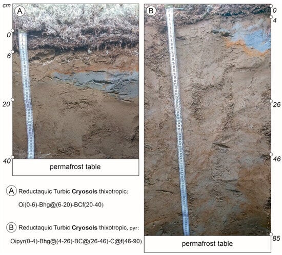 Typical profiles of Turbic Cryosols in control (A) and post-pyrogenic (B) geosystems of the study area.
