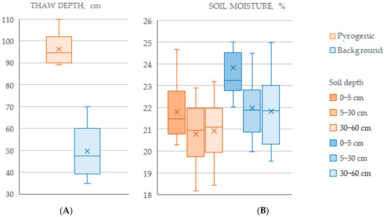 Boxplots of seasonal thaw depth (A) and soil moisture (B); rectangle borders mark the first and third quartiles; crosses indicate means; horizontal lines represent medians; whiskers with caps denote the minimum and maximum values.