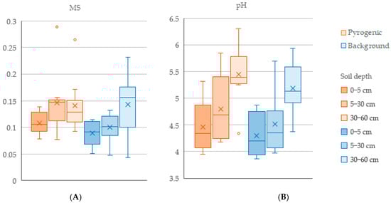 Boxplots of magnetic susceptibility (A) and pHKCl (B) of the studied soils; rectangle borders mark the first and third quartiles; crosses indicate means; horizontal lines represent medians; whiskers with caps denote minimum and maximum values without outliers; dots represent outliers.