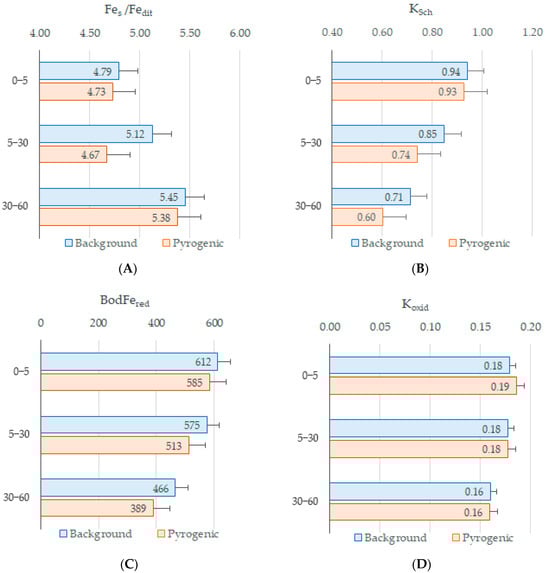 Our calculations of the Bodégoma criterion (BodFered) have revealed an increase in the biologically reducible iron (Fered) in the middle part of the pyrogenic soil profiles (Figure 5C). This trend is likely associated with an increase in the concentration of Feox. The Bodégoma criterion reflects the concentration of ferrous iron reduced by microorganisms under anaerobic conditions [46]. However, in pyrogenic soils, BodFered values significantly decrease, particularly in deeper horizons, where they are reduced by nearly a half (Figure 5C). This indicates a reduction in the ferrous iron, formed through biological processes, which aligns with an increase in the proportion of crystalline iron (Fec), which is less prone to reduction.