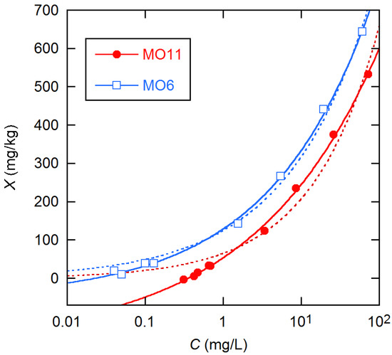 It is worth emphasizing that the most important result of the VF estimation efforts was the need to include some uncertainty in C. This need can be understood from the observation that most of the sorption experiments included some experiments where, within uncertainty, the measured C was 0.00 (see Supplementary Materials (SI)) [28,29]. To avoid computational problems, such values were typically set to a very small value, like C = 0.0001 mg/L, which is reasonable, since simplest residuals analysis indicated σC ~ 0.1 mg/L. (Note that σC is numerically ~500 times the absorbance uncertainty, from the conversion of the spectrophotometric absorbance to C). Taking typical a and b values of 100 mg/kg and 0.3, respectively, the values of aCb range from 50 down to 6 mg/kg as C drops from 0.1 to 0.0001 mg/L. The differences in these values hugely exceed any reasonable uncertainty for X and C0—roughly 0.3 mg/L for the latter from simplest residuals analysis. Allowing for even a small uncertainty in C completely neutralizes such problems. Anyone analyzing sorption data without allowing for uncertainty in C, as is customary in the use of Equation (3) as the fit model, should take care to ensure that these low-C problems do not affect the analysis.