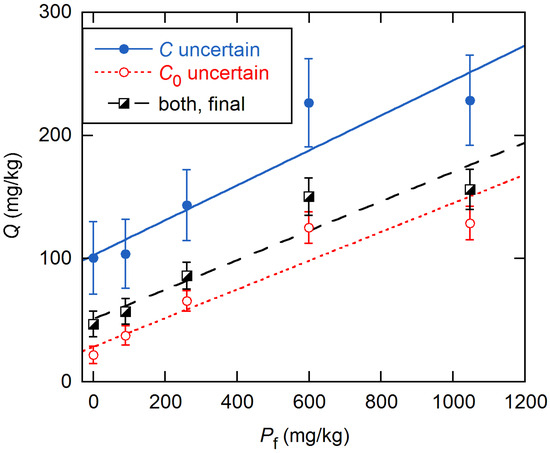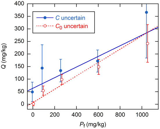 Sorption Q estimates for KA soils from analyses of individual Pf datasets, using Equation (6) and assuming uncertain C and uncertain C0, with the other variable treated as error-free. The illustrated lines are results of weighted fits giving intercepts 63 (33) and 8 (7), and slopes 0.21 (9) and 0.27 (4), for C and C0 uncertain, respectively. Displayed error bars are 1 SE. Points have been displaced on the Pf axis for clarity of display.