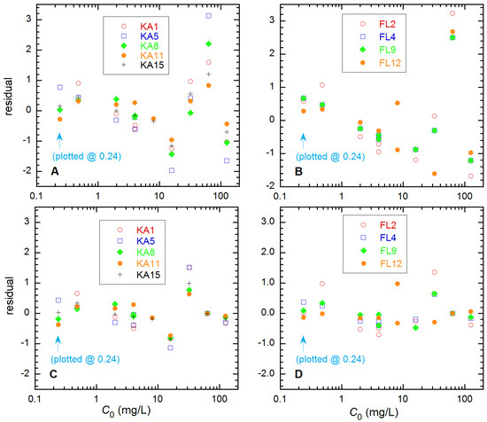 Least-squares fit residuals from C0-uncertain analyses of the KA (left) and FL (right) soils, displayed vs. C0. From Equation (6), the residuals are 10 times the C0 disparities. Results at top (A,B) are from fitting all data, at bottom (C,D) after removal of the values at C0 = 63.5 (shown with a value of 0.0). (The left-most points in each frame are for C0 = 0 but have been displaced for the log display).