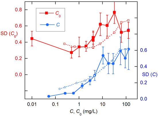 Standard deviations from studentized residuals obtained fitting data for all soils except MA to the global model, assuming, in turn, constant uncertainty for C and C0 and no error for the other variable. For C0 (SD scale left), the lowest abscissa values were 0.0 but were increased to 0.01 for this logarithmic display. For C, the abscissa is the mean of close-lying values; for C0, it is the employed concentration. Dashed lines and open points are results for final estimated VFs (see below and Supplementary Materials (SI)).
