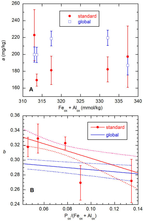 Similarly, the great sensitivity of the KA results to the choice of included data means that those results must be considered more uncertain than is indicated by the KA parameter SEs in Table 2. This behavior heightens concern that the Freundlich model may not be suitable for the KA soils. The problem is discussed in more detail in the Supplementary Materials (SI), which also includes all the data, tabulated results for the individual-Q global model, and results from several alternative global fits of the KA data. All these results assume error-free oxalate assays and pHs, when in fact these are all measured quantities subject to uncertainty. Allowing for their uncertainty is not simple, as single measurements of each of these apply to all the data for a given Pf. Spot checks of ±4% changes in Pox and (Feox + Alox) in selected datasets gave smaller % changes in q0 and q1, so such effects are likely much smaller than the SEs reported in Table 2.