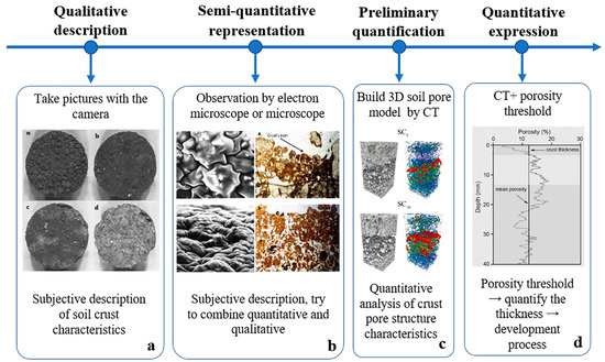 PSC is constantly undergoing dynamic changes due to factors such as rainfall and runoff. The formation of crust alters the structural characteristics of soil (e.g., porosity, water content, and bulk density), directly affecting the infiltration and evaporation of water. Understanding how crust develops can therefore effectively allow us to monitor the trends of the changes in soil properties and identify the response of crust development to slope erosion. Research on crust development progresses through four stages depending on the methods of observation and quantification: qualitative description, semiquantitative representation, preliminary quantification, and quantitative expression (Figure 2).