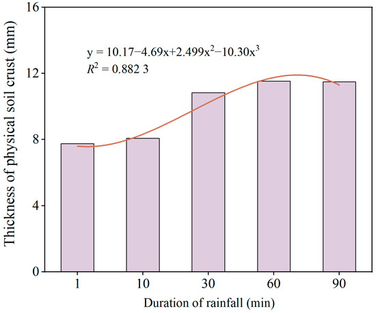 The kinetic energy of the raindrops and the runoff formed by the convergence of rainwater during rainfall are crucial conditions for the development of PSC. The compacting action of raindrop impacts, the transporting action of runoff, and the wetting and dispersion of particles are all indispensable factors for driving the development of crust [64]. Bu et al. [79] found that the main forces driving the formation of loess crust were the combined effects of compaction by raindrops and the wetting and dispersion of particles, both of which were indispensable. Hu et al. [45] reported that the continuous impact by raindrops caused particles to disperse. Some of these particles filled soil pores, and others were displaced by runoff, ultimately leading to the rearrangement of surface particles into a dense thin layer. The duration and intensity of rain also affect the development of crust. The duration of rain alters the timing of surface runoff, and the intensity of rain directly influences the magnitude of the kinetic energy of the raindrops. Experiments have demonstrated that longer rains and higher raindrop kinetic energies lead to higher rates of crust development [71,80].