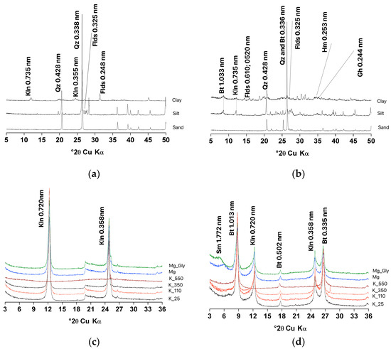 The mineralogical characterization of sand, silt, and clay fractions from both soils was determined using X-ray diffraction (XRD) in the form of unoriented powder, operating with Cu Kα radiation at a speed of 1° min−1 (2θ) recording a range of 5 to 50° (2θ) (Figure 2a,b). The clay fraction was separated by sedimentation, and then dried in an oven at 60 °C, ground using an agate mortar and pestle, and passed through a 100-mesh sieve. The interpretation and identification of the diffraction patterns of the minerals in the sand and clay fractions were based on diffraction peaks obtained through thermal and saturation treatments as well as interplanar spacing (d) [17,18,19] (Figure 2).