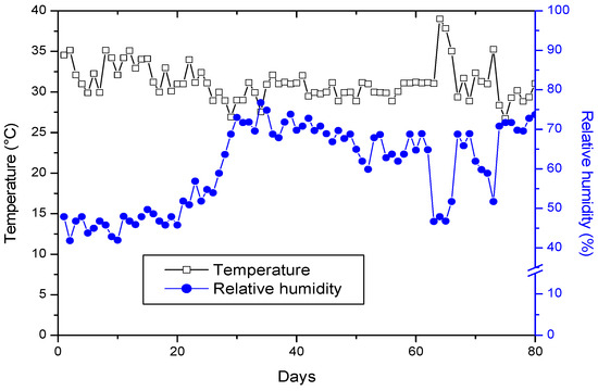 Temperature and relative humidity in the greenhouse during the 80-day experiment.