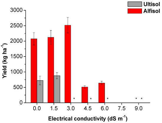 Yield of Vigna unguiculata cultivated in Ultisol or Alfisol under different electrical conductivity levels for 80 days. An asterisk indicates that the plants in the Ultisol did not produce pods.
