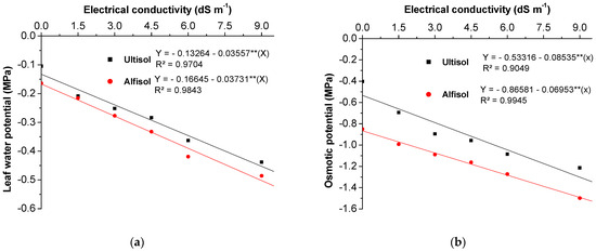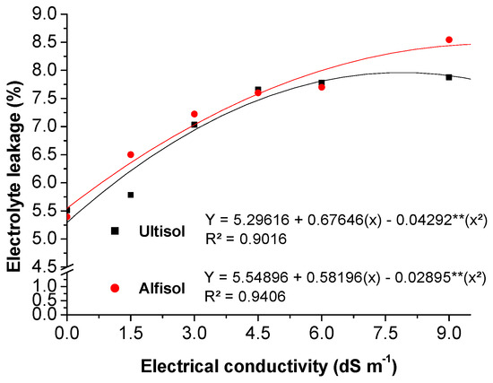 Greater EL was observed for plants in Alfisol, with a maximum interpolated value of 8.47% at an EC of 10.05 dS m−1, approximately 6.43% higher than the maximum interpolated value observed for plants cultivated in Ultisol (7.96%) at an EC of 7.88 dS m−1 (Figure 6).