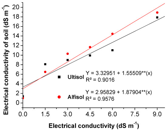 Increasing the EC of the irrigation water to 1.5 or 3.0 dS m−1 increased the EC of the saturation extract of both soils by about three-fold, rendering them saline soils [44]. Irrigation with saline water in closed systems promotes rapid salinization of the soil, which can cause soil EC to reach values more than twice that of the EC of the irrigation water, leading to soil salinization and/or sodification [45].