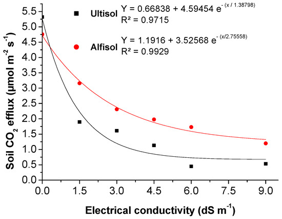The soil CO2 efflux exponentially decreased as the EC of the irrigation water increased in both soil types. The Alfisol exhibited a horizontal asymptote of 1.19 μmol m−2 s−1, compared with 0.66 μmol m−2 s−1 in Ultisol, demonstrating that the stabilization of CO2 efflux in the Alfisol was 80.3% higher under high salinity conditions. Furthermore, Ultisol exhibited a higher decay rate (98.64%), as reflected by its decay constant (1.39), compared with that of Alfisol (2.76), which led to a faster tendency for Ultisol to approach its minimum value (Figure 8).