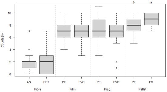 Boxplot for the observed microplastic counts in the collection flask after simulated rainfall, categorised by shape and polymer type. Acr, acrylic; PE, polyethylene; PET, polyethylene terephthalate; PS, polystyrene; and PVC, polyvinyl chloride. Letters (a and b) at the top of the plot indicate statistical differences between polymers by type, with differences observed only for pellets.