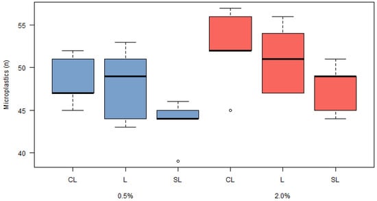 Boxplot showing the total microplastic counts in the collection flasks after simulated rainfall. Data from flumes with a 0.5% slope gradient are represented in blue, while data from flumes with a 2.0% slope gradient are shown in red. CL, clay loam; L, loam; and SL, sandy loam.