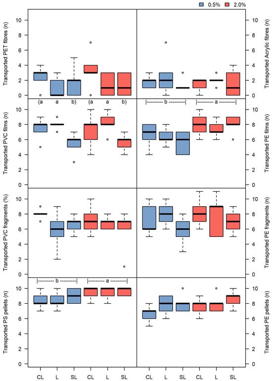 Boxplot of observed microplastic counts in the collection flasks after simulated rainfall, categorised by shape, polymer type, slope, and soil texture. CL, clay loam; L, loam; and SL, sandy loam. Acr, acrylic; PE, polyethylene; PET, polyethylene terephthalate; PS, polystyrene; and PVC, polyvinyl chloride. Letters (a and b) at the top of the plot indicate statistical differences between polymers by type, with differences observed only for pellets.