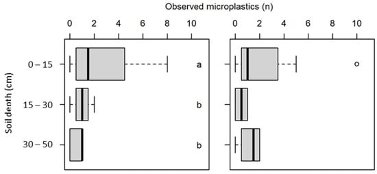 Boxplot of observed microplastic counts in the soil samples of Filed A (left) and Field B (right) by depth. Different letters indicate statistically significant differences among the soil depths. Letters (a and b) at the top of the plot indicate statistical differences between polymers by type, with differences observed only for pellets.