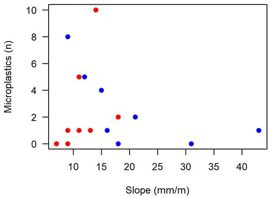 Relationship between the paddock slope gradient and microplastic counts in the topsoil. Paddocks from Field A are represented in blue, while paddocks from Field B are shown in red.
