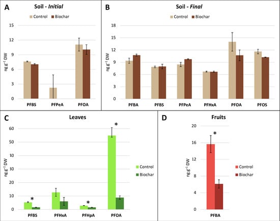 Regarding tomato leaves, only PFBS, PFHxA, PFHpA, and PFOA were found, whereas PFBA was below the LOQ value (Figure 1C; Table S5). Leaves of plants grown in biochar-amended soil had a lower content of all detected compounds, with significant reductions ranging between −45% (PFHpA) to −84% (PFOA). Tomato fruits only accumulated PFBA, and the fruits of plants grown in biochar-amended soil showed a statistically significant reduction in PFBA concentration of −61%, compared to plants grown in unamended soil (Figure 1D; Table S5).