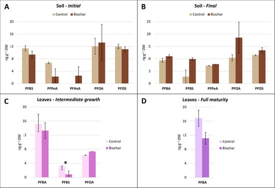(A) PFAS concentrations measured in the soil at the beginning of the red chicory experiment. (B) PFAS amounts detected in the soil at the end of the red chicory cultivation. (C) PFAS content measured in red chicory leaves collected at the intermediate growth stage. (D) PFAS amounts detected in red chicory leaves collected at full maturity. In all plots, values are expressed as ng g-1 DW and indicate mean ± standard error (n = 3 for soil; n = 6 for leaves); * indicates p ≤ 0.05 for statistical tests on amounts detected in biochar-amended samples vs. control samples.