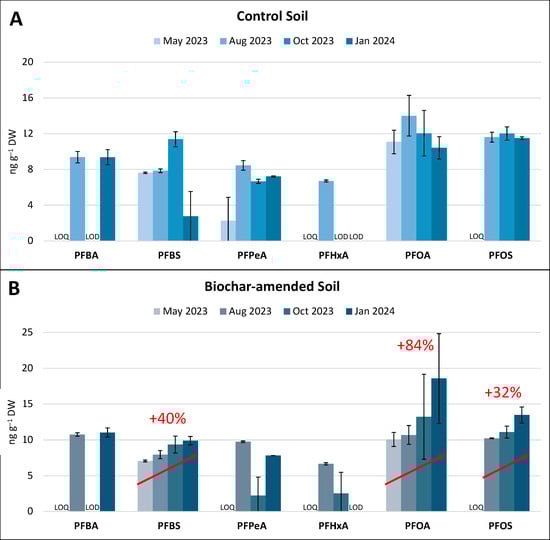 Trends of PFAS accumulation in control soil (A) and biochar-amended soil (B) from the beginning to the end of the experimental period. LOD and LOQ indicate concentrations below the detection limit and the quantification limit, respectively. Error bars represent the standard error associated with the mean values (n = 3). Percentage variations are calculated as January 2024 vs. May 2023 (except for PFOS, which is calculated as January 2024 vs. August 2023).