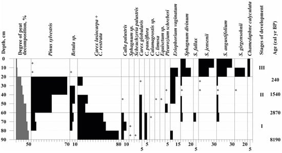 The botanical composition of peat sediments was analyzed at the Institute of Biology, Karelian Scientific Center of the Russian Academy of Sciences in accordance with GOST 28245-89 standards []. The percentage content of plant macrofossils was estimated using a polarizing microscope “ADF U300B” with eyepiece PL10X/22 wide field. The ratio of macrofossils of all identified peat components was reported in 5% increments. The degree of decomposition was determined in 5% increments. The identification of plant residues as belonging to a certain plant species was performed using the atlas of plant residues in peats []. Stratigraphic diagrams of peat composition were constructed using the software CorelDraw 11.0 (Alludo, Ottawa, ON, Canada).