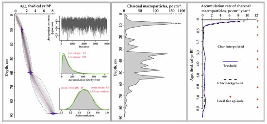 - Higuera, P.E. CharAnalysis 0.9: Diagnostic and Analytical Tools for Sediment-Charcoal Analysis; Montana State University: Bozeman, MT, USA, 2009; p. 27. [Google Scholar]