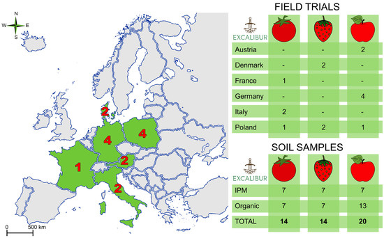 The study utilized data obtained from 15 locations situated in Austria, Denmark, France, Germany, Italy and Poland (Figure 1). The fields, selected for establishing trials planned in the Excalibur project, represented different climatic conditions, and were characterized by diverse field histories and management methods (detailed information about the fields’ localization, their characteristics and chemical properties can be found in Electronic Supplementary Material Table S1). Some of the fields were already hosting the target crop (e.g., existing apple orchards), while others were prepared for the establishment of trials. For this reason, three cropping systems were considered: a “seasonal vegetable” system (including tomato production in the rotation), a medium- and a long-term fruit system (for strawberry and apple crops, respectively). The fields were managed according to organic farming (“ORG”) or conventional methods applying integrated pest management (“IPM”).