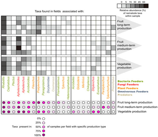 The high absolute abundance of PF found in the long-term cropping system confirmed previous findings [52,53,54]. Moreover, a significant increase of PF and specifically Pratylenchus specimens, one of the best known plant-parasitic nematodes commonly associated with symptoms of apple replant disease [55], were observed in the Polish long-term fruit cropping system in comparison with the other production systems, in accordance with previous reports from different countries [56]. The high relative abundance of PF in the vegetable cropping systems was expected, as these crops, which are grown in specialized farms, are frequently affected by attacks from parasitic nematodes [57].