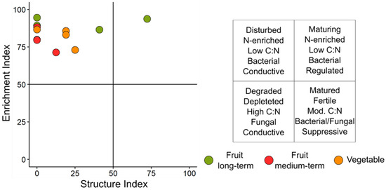 Few significant differences were observed in the nematode communities associated with the three cropping systems. The vegetable cropping system displayed the highest biodiversity measured by the Shannon Index (Index H) and total genera number (1.8 and 10.3, respectively), while the medium-term fruit production field had the lowest biodiversity (p-values 0.0322 and 0.0389, respectively) as expressed by these two parameters (1.2 and 6.3 respectively). CI, which is related to the predominant decomposition pathway of organic matter, showed significantly (p-value 0.0489) higher values for the medium-term fruit cropping system (22.1) in comparison to the long-term one (7.1). Similar differences were observed for BI (p-value 0.0310), which is a measure of food web structure and complexity. Three indices associated with the environmental disturbance that can be caused by various factors (MI, MI2-5 and ƩMI) showed non-significant differences (p-values 0.2480–0.4400) among the three analyzed cropping systems. Values of the Plant-Parasitic Index (PPI) did not differ among the cropping systems, although the lowest value was observed for the medium-term fruit cropping system. EI, describing food availability and nutrient enrichment, and SI, expressing the soil food web structure and disturbance, showed rather low and comparable values between the analyzed cropping systems (p-values 0.0506–0.3032). Utilizing these latter indices for the food web analysis, highlighted for almost all samples a disturbed condition, conductive and dominated by bacterivorous nematodes (Figure 3). However, no specific clustering depending on a cropping system was observed.