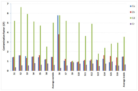 The calculated CF values were further classified into four classes according to Hakanson [40], namely, low (CF < 1), moderate (1 ≤ CF ≤ 3), considerable (3 ≤ CF ≤ 6), and very high (CF ≥ 6) contamination degrees. Indeed, this classification was considered in several previous related studies [4,20,43].