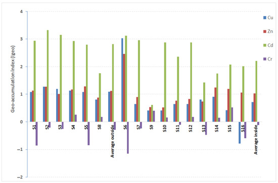 where n denotes the trace element in the study soil; C denotes average soil heavy metal content (mg/kg); B denotes the geochemical background value of the trace element (mg/kg); and 1.5 is a correction factor [50,51,52]. In this study, we referred to the global average Cd, Cr, Cu, and Zn metal contents in soils of 0.35, 70, 30, and 90 mg/kg, respectively [42,53]. Indeed, all previous related studies in Morocco have considered the global heavy metal concentrations in soils as geochemical background values. The Igeo values can be classified into seven classes according to Müller [50], namely, no pollution (Igeo ≤ 0), no to moderate pollution (0 ≤ Igeo ≤ 1), moderate pollution (1 < Igeo ≤ 2), moderate to heavy pollution (2 < Igeo ≤ 3), heavy pollution (3 < Igeo ≤ 4), heavy to extreme pollution (4 < Igeo ≤ 5), and extreme pollution (Igeo > 5) [4,46,54].