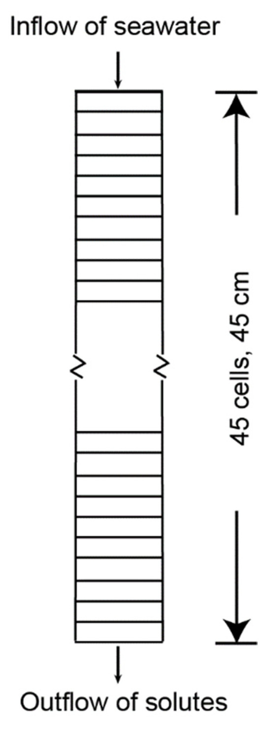 The microcosm core dimensions for both models were incorporated into a model grid that uses 45 1 cm cells for the 45 cm core length (Figure 3), with a core volume of 7.95 L. For the two PHREEQC models (Tables S1a,b and S2a,b), the sediments in the columns were initially assumed to be filled with fresh porewater as defined in solutions 1–45 and equilibrated with the DF and DD sediments, respectively (Table 3). Establishing the initial chemistry involved assigning surface exchange sites, solid phase reactant concentrations, kinetics, and solution concentrations for each cell (Table 3 and Table 4). The infilling seawater solution (“Solution 0”) was then introduced to the column, and transport was modeled by “shifting” solution 0 to cell 1, the solution in cell 1 to cell 2, and so on until solution 45 is shifted to cell 45, which is equilibrated with exchange 45, surface 45, equilibrium phases 45, and kinetics 45. The keywords, including “exchange”, “surface”, “equilibrium phases”, and “kinetics”, define the input for PHREEQC, as explained in Parkhurst and Appelo [29]. “Exchange” defines the exchange assemblage composition, “surface” defines the composition of surfaces, “equilibrium phases” defines a singular phase that reacts reversibly, and “kinetics” specifies kinetic reactions and parameters for reactive-transport calculations. The number of cell shifts and the time per shift used in the simulation are shown in Table 1. At every time step, the speciation of the solution and its reaction with sediments was computed.