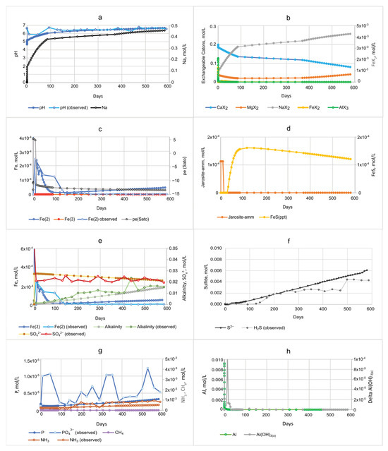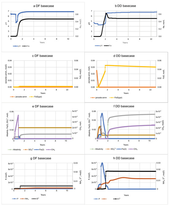 The PHREEQC models assume that fresh porewater initially fills the sediment cores (Figure 3) and is replaced by an influx of seawater for 20 months, to be consistent with Portnoy and Giblin [4] experiments. In simulations of DF and DD sediments, seawater passed through the columns after about 8 h and 5 h, respectively. The models had similar initial solute concentrations of freshwater, but the pH, Fe(II), and ammonium concentrations differed. Seawater concentrations (Table 1) were the same for both microcosm models.